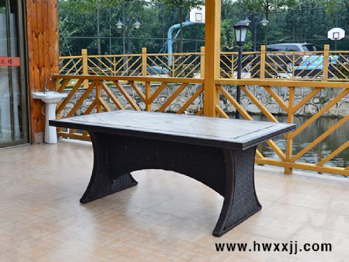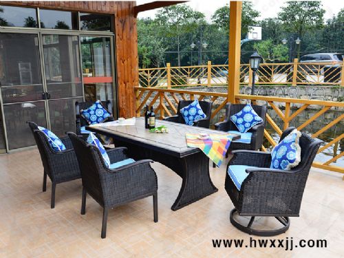 休闲家具所使用的是进口环保PE藤条,产品具有延展性,可洗、不易霉变、防紫外线及抗不良天气环境等特点,耐候达到3000小时以上。桌子底部采用圆弧形设计,线条优美,更加时尚,造型独特。
