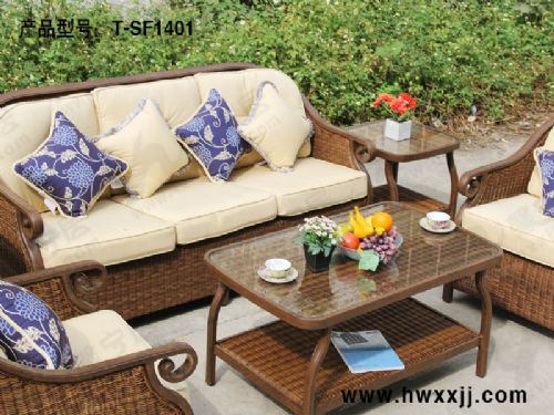 1、造型独特,做工细致。藤编沙发采用铝合金与藤条完美结合,造型时尚新颖,沙发外框架采用手工刷漆处理,让金属展现出实木的效果,仿藤采用全手工编制,为其增添了一份人气。