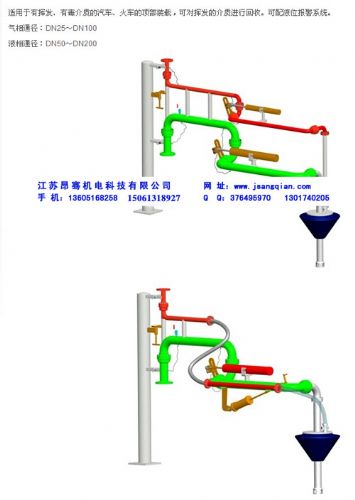 弹簧缸平衡装置,所述的气相管与液相管并排设置,气相管设有与液相内臂固定的内管、与液相外臂固定的外管,内管与外管之间通过皮线软管相接,液相内臂与气相内管之间设有回流管,在回流管上装有关断阀。装车结束后,打开关断阀,使气相管中冷凝的介质流入液相管中,保持气相管畅通。气相管上装有球阀和安全