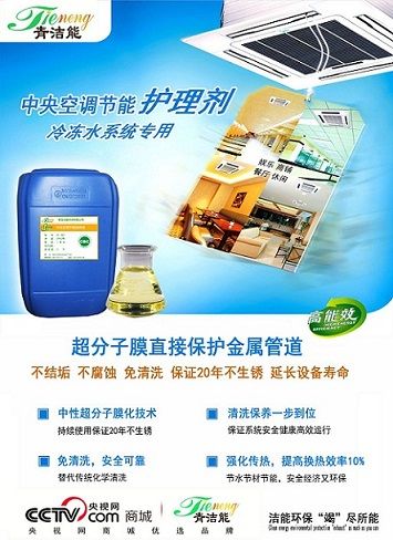 中央空调冷冻水系统特点研发的一项高新技术产品, 韩泰清高工是国家化学清洗标准HG/T2387-92《工业设备化学清洗质量标准》的起草人和起草组负责人,具有40多年的防腐清洗和工业水处理实践经验,青洁能韩工带队研发的中央空调节能护理剂,是通过药剂的超分子识别和选择性组装作用,在金属表面形成优于纳米膜的超分子膜,保证中央空调