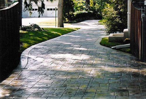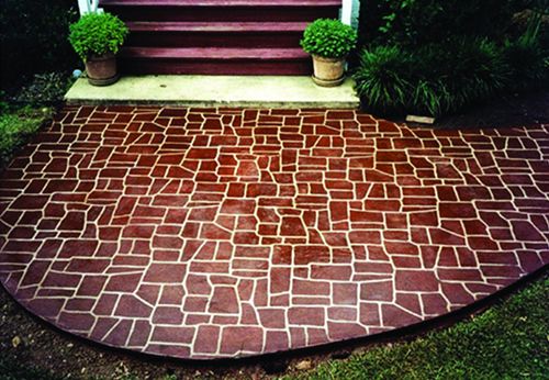 提浆收光 → 播撒强化料 → 精收光 →补强化料 →二次收光→撒脱模粉→用模具压印地面→封闭道路→冲洗艺术地面→涂刷保护剂→完工