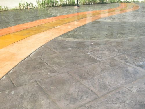 4、撒布压模地坪彩色脱模粉。压模地坪脱模粉的撒布也应掌握好时机和均匀度。撒布脱模粉应在准备开始压模时进行,由于该材料是轻质粉末,所以撒布的时候应该避开大风,并顺风方向撒布。脱模粉的用量与均匀程度和施工人员撒布的熟悉程度有关。