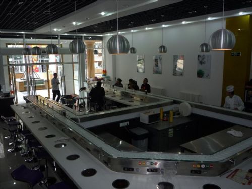 5、回转火锅传送设备可以让客人清楚选择各种菜品,而不再只是看不到实际菜品的菜单。