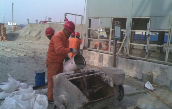 (2)耐磨料的拌合可采用机械搅拌或人工搅拌。*采用机械搅拌方式,搅拌时间一般为2~3分钟。采用人工搅拌时,应先加入2/3的用水量拌合4分钟,然后加入剩余量搅拌至满足施工和易性为止。