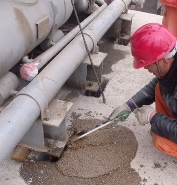 植筋胶锚固钢筋棍,钢筋棍埋设深度50mm,外露15-30mm(设计抗磨层厚度的1/2),钢筋棍之间的间距250-300mm;抗磨层厚度小于50mm,只需在钢筋棍前端弯 成“L”即可,厚度大于50mm,则需在钢筋棍的顶端用盘条焊接成网。