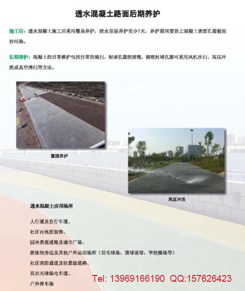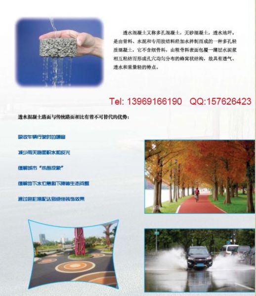 功能:透水混凝土由欧美、日本等国家针对原城市道路的路面的缺陷,开发使用的一种能让雨水流入地下,有效补充地下水,缓解城市的地下水位急剧下降等等的一些城市环境问题。并能有效的消除地面上的油类化合物等对环境污染的危害;同时,是保护地下水、维护生态平衡、能缓解城市热岛效应的优良的铺装材料;其有利于人类生存环境的良性发展及城市