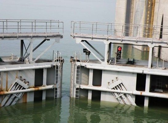 。人字闸工作时,两扇门叶构成三铰拱以承受水压力;水道开时,两扇门叶位于边壁的门龛内,不承受水压力,处非工作状态。人字闸门一般只能承受单向水压力,而只能在上、下游水位相等,静水状况下操作运行,*用于通航河道的船闸,作为工作闸门布置在上、下闸首。