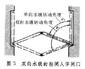左右两扇门叶分别绕水道边壁内的垂直门轴旋转, 关闭水道时,俯视形成“人”字形状的