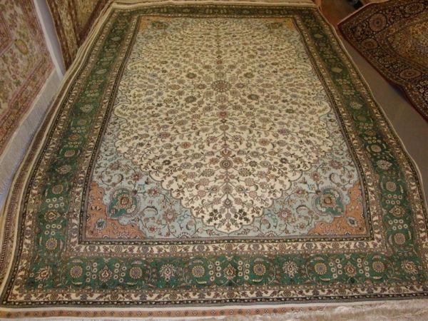 该地毯是用桑蚤丝编织,整体效果金壁辉煌,色彩艳丽,花纹动感灿烂.毯子中的珍品!