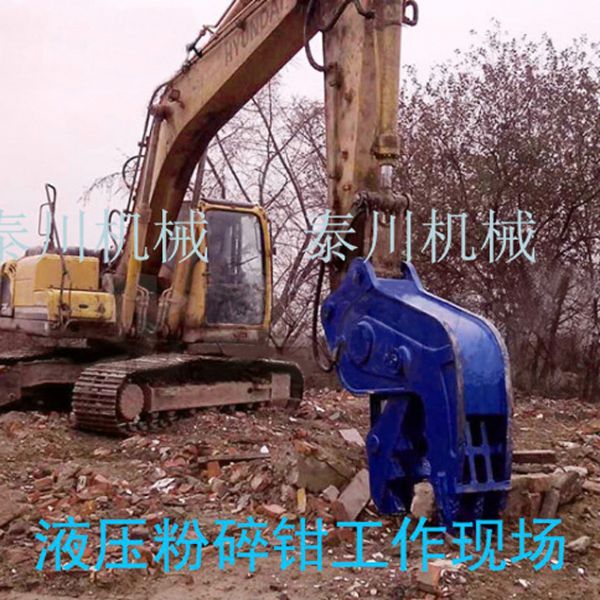 液压油缸施加运动压力,使液压钳的运动颚和固定颚实现张合运动,实现粉碎效果。