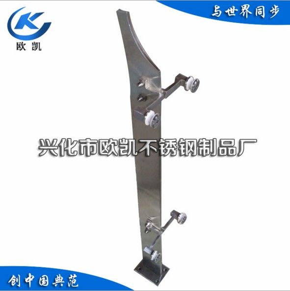 扶手的支撑柱,表面一般是磨砂拉丝,或镀金处理。立柱主体板材一般选用6-15MM厚,市场上规格多为高度为850*50MM或1050*50MM,加上玻璃抓手等配件。立柱主体是靠精准切割设备切割出来的,可以切割出各种形状,再钣金加工,玻璃驳接