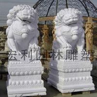 石雕狮子,卷发巨眼,张口施爪,总是成对的放置。左边的是雄的右边的是雌的,雄狮爪下有一个绣球,雌狮的爪下是一个幼崽。狮子头上凸出的皱褶按它守卫主人的官阶而定,因此成了权势的象征。民间的