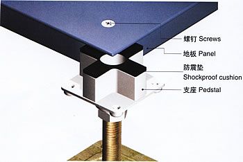 螺钉组成.安装时地板放置在带有防震垫的支座上,螺钉穿过地板周围的角锁孔直接连接在支座上,支座为镀锌及铸铝合金结构,高度可调并能自锁.