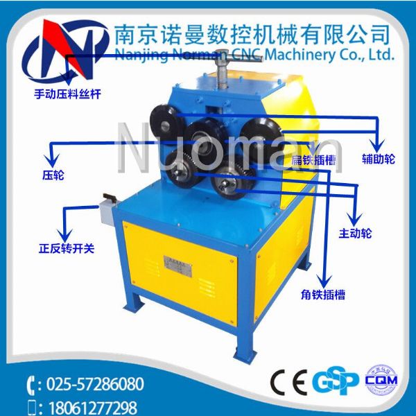 南京诺曼生产的角铁卷圆机根据不同的需要更换轧辊,可卷角铁、扁铁、圆管,槽钢,