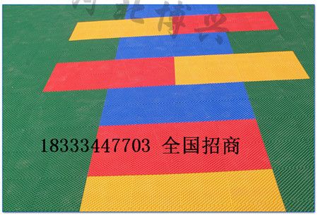 拼装地板,双层结构(运动表面层/结构稳定层)适合跳飞机,迷宫,跑道,各种运动场,还可用于停车场,轮滑场表面层为菱形镂空面设计,由高冲击聚丙烯共聚物(PP)制成的悬浮式模块,907个坚固的支撑结构提供垂直缓冲性能,正面的扣式锁定系统提供机械水平缓冲性能。