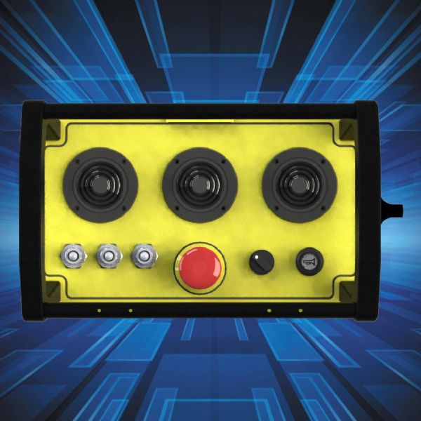 面板布局:3摇杆,每个摇杆四个执行方向,每个方向执行5段落5速,布局3个两方向拨杆,每个拨杆可实现前后2路开关量,1个喇叭按钮,另有启动+急停旋钮;