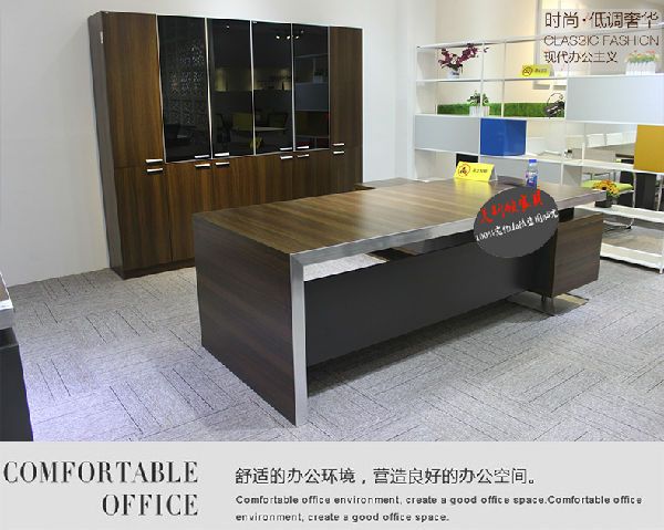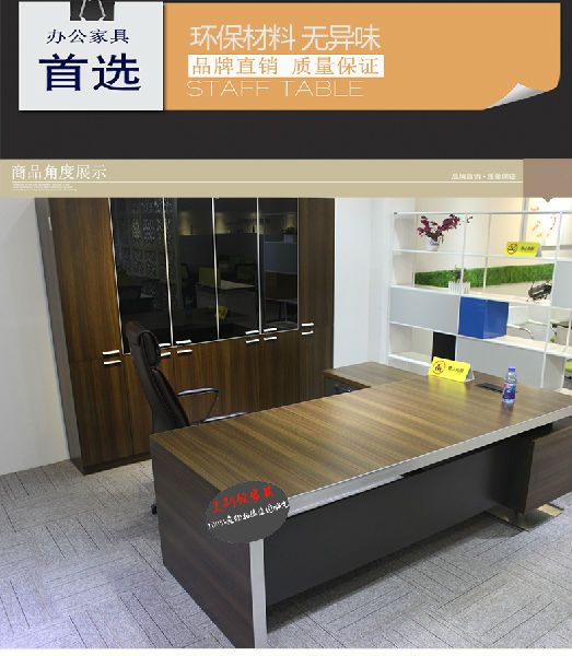 1.全部采用E1环保MFC材质标准,台面25MM,四周45度斜边工艺处理,桌面选配软胶写字板; 2.付柜采用16MM+8MM(MFC),超薄边框工艺,门板、抽面采用45度斜边拉手处理,配置三抽屉一件掩门,柜内暗式走线系统,标配铝制多功能模块线盒,三节道轨,缓冲