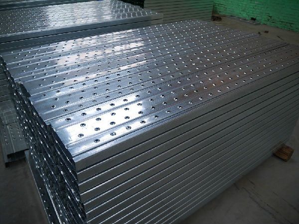 脚手架配套使用的一种配套工具。我公司引进韩国先进全自动钢跳板生产流水线,生产速度快,每班可连续出900--1000片产品。本产品具有防火、重量轻、耐腐蚀、耐碱且抗压强度高、表面凸孔带翻边防滑效果好,孔距整齐成型规范、外形美观、经久耐用(正常施工可连续使用6-8年)特有的漏沙孔防积沙特点,尤其适合造船厂涂装喷砂车间的使用。使用本产品时,搭建脚手架的