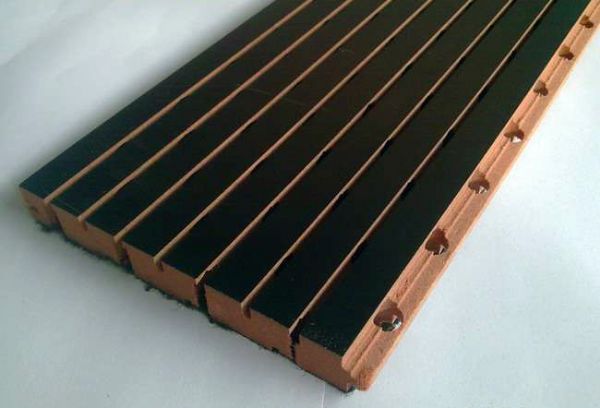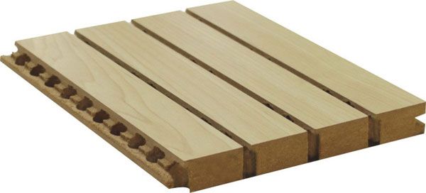 密度板的正面开槽、背面穿孔的狭缝共振吸声材料;孔木吸音板是一种在密度板的正面、背面都开圆孔的结构吸声材料。两种吸音板常用于墙面和天花装饰。