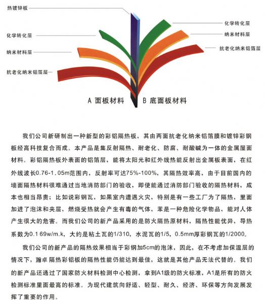 钢板经高科技复合而成。本产品是集反射隔热、耐老化、防腐、耐酸碱为一体的