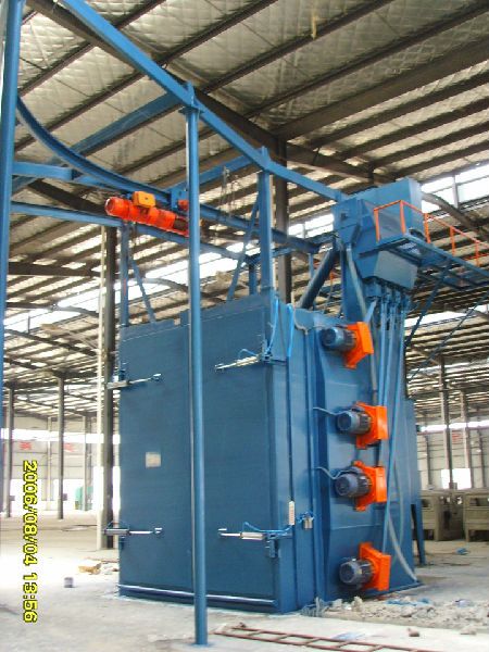 单吊钩式的工作顺序为单吊钩进出,一钩清理完毕之后,设备停止,吊钩从清理室出,工人下工件后再上件抛丸