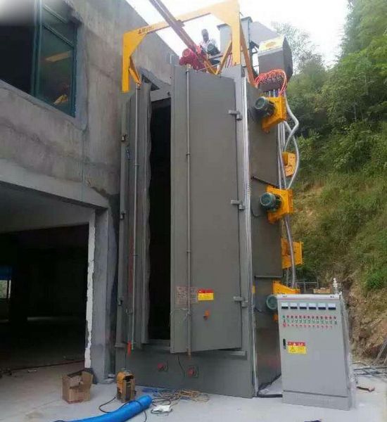 双吊钩式为吊钩装载工件,一钩在清理的同时另一钩上件,交替进入抛丸清理室内,大大节约工作时间,提高工作效率。