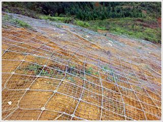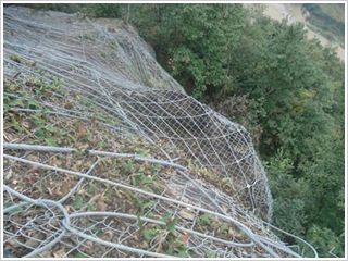 钢丝绳网为主的各类柔性网覆盖包裹在所需防护斜坡或岩石上,以限制坡面岩石土体的风化剥落或破坏以及为岩崩塌(加固作用),或将落石控制于一定范围内运动(围护作用)。是