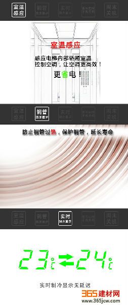 节能空调,能效比达到2.69,低耗高能,遥控器控制和全自动运行相结合,自动恒温,节约用电,多层防御净化装置,有效去除混浊空气;负离子杀菌,净化轿厢空气、减菌、防霉、除臭,轿厢内可用遥控器控制、操作非常方便。