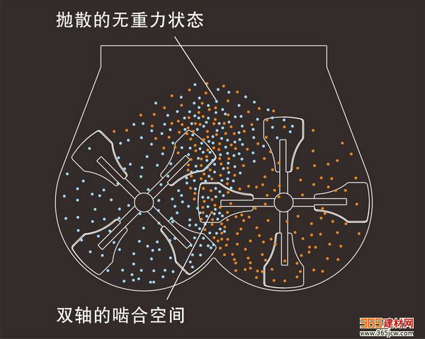 2、双轴相反方向旋转,物料左右交替,相互剪切。