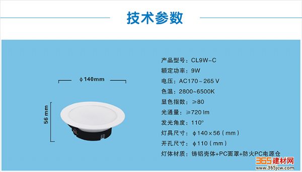 技术指标:额定功率9W;光通量≥720Lm;显色指数≥80;色温 4000K(2800~6500K可选)±300K;材质:压铸铝散热+PC罩+防火PC