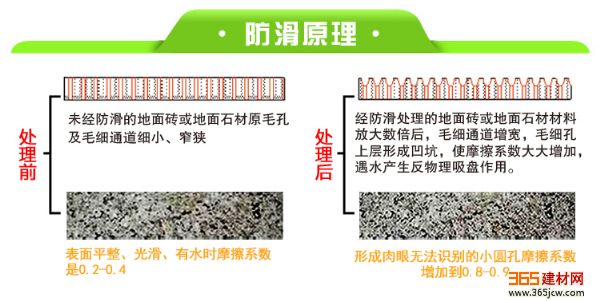地砖及石材通道,令该通道加宽,使其上层形成微孔后在表面构成细微的菱纹,表面摩擦系数0.5-0.9之间,当人员步行之上,鞋底与砖面接触产生的压力形成真空,转化成物理吸盘作用,形成稳定的防滑效果,人员在上面可轻松自如行走;经处理后的石质材料表面色泽不变,无痕迹。同时该产品具有很强的耐化学性、耐候性、抗紫外线性等,一定程度上也是对地面起保养防护效果。