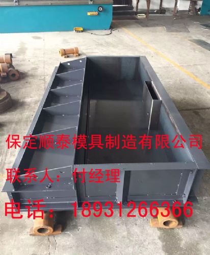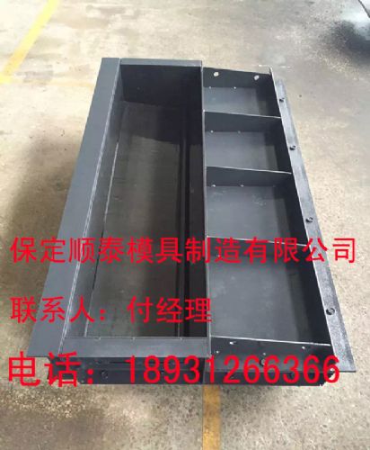 选用5mm冷板通过裁剪、焊接制成,外加强固筋,经用不变形,遮板钢模具的制作构造十分便于施工方运用,此模具用螺旋固定,能够拆开,不会损坏遮板水泥件,出模速度快,可进步出产效率。高铁遮板钢模具的尺度规范:1996*93*20 1326*93*20 1261*93*20 1780*93*20 1680*93*20 单位cm ,也能够定做。遮板钢模具首要用于出产高铁掩盖