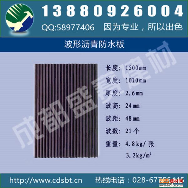 是坡屋面通风隔热防水材料,它由植物纤维在高温高压下浸渍沥青而成,其专利的胎基一次压制成型技术和21个波/米的波密度,保证了板材紧密厚重,防水性能优异,并具有高抗压强度。作为坡屋面防水*一优选材料和*高质量的防水板,波形沥青防水板高达2.6mm的平均厚度及6.5kg/张(3.2kg/平米)的 平均重量确保了防水的长期可靠性,为此,由厂家提供25年质量保证。