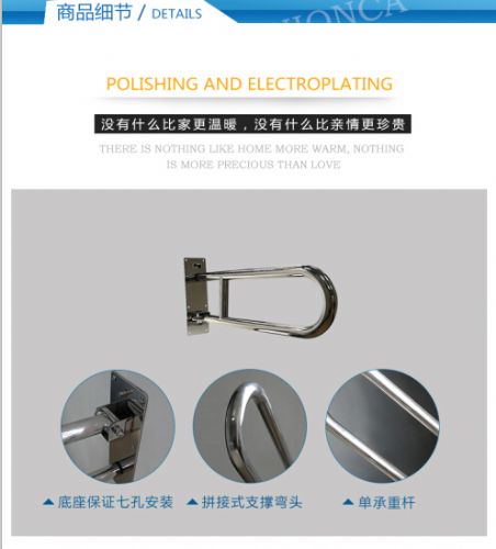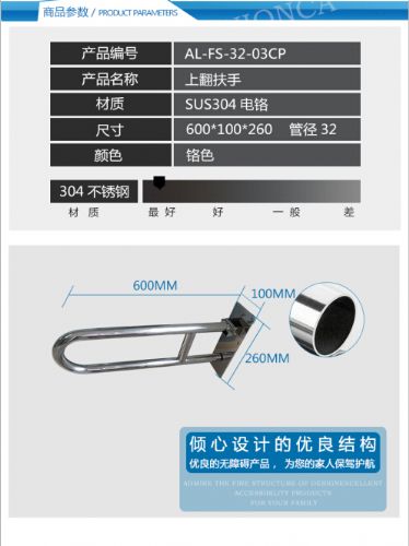 扶手守护家人成为现实,(1)300承重设计,*高承重力达600斤,杜绝因质量问题所引发的2次伤害。(2)抗菌尼龙运用医用尼龙材料,五毒,耐磨易清洗,耐热,抗尘等特点,高达99.9%抗菌力。(3)防滑设计 把手区有凹凸的尼龙颗粒,加上材料本身耐磨特性,很好的加强了防滑力度。(4)防静电 外壳运用尼龙塑料材质制作而成,具有高电阻性、杜绝浴室漏电意外发生。(5)平衡防跌 当人乏力与运动不便情况下,第三支撑点往往起到平衡作用,它将是*好的助力。(6)常温把手,尼龙表面材质的耐热性,耐寒性,让把手面表至始都保持常温的手感。