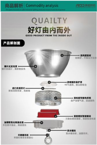 特性: 是一款采用了进口超高亮度集成LED芯片,一次压铸成型的磨砂工艺外壳,高导热鳞片式散热器以及防水稳压恒流