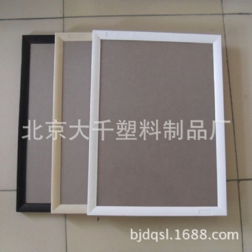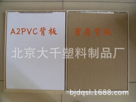 透明板、背板组成。前框:采用ABS原料一次加工成型,前框颜色可以根据客户要求调制不同颜色,无须后期处理。透明板:采用高透明度PVC板与原始的加工板相比透明度更高、韧性更好不会破碎。背板:采用PVC材料一次成型与原始的木板相比减少了产品的重量,更容易固定在墙面上不易掉落。与传统的加工方法相比更节约了生产成本、提高了生产效率。或