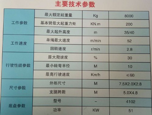 工作参数:*大额定起重量8000Kg 基本臂*大起重力矩 200KN.m *大起升高度 35/40m