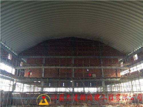 钢板厚仅为1.5mm,用钢量约为22kg/m2。由于在制作、安装过程中的各个环节均通过机械操作完成,因而施工速度非常快,一般情况下一个台班可制作安装500~800m2卸粮罩棚,1万m2的卸粮罩棚结构可在20天内完成。这种结构艳丽的色彩来源于材料的彩色涂层,同一建筑可选用多种颜色的彩板进行组合。因受结构成型工艺的制约,这种结构主要为圆弧外形,但与国内常见的平屋顶及人字形屋顶相比不失为一种新的变化。另外不同曲率的圆弧,以及对圆弧拱壳进行切割或相贯处理,可实现更为优美的建筑造型。
