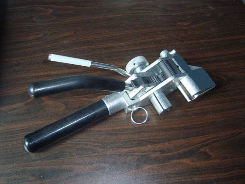 3.将手柄向前推,向下拉刀柄,切除打包带,锁紧搭扣,移去工具。