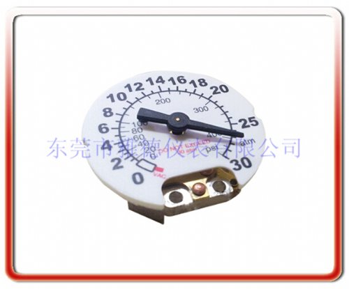 2. 表盘刻度外圏数字0~30bar,内圈数字0~400psi, 内外圈均用黑色,真空范围“0”以下用红色
