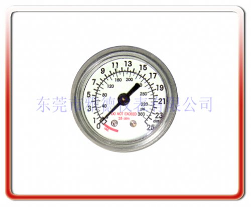 2. 表盘刻度外圏数字0~30bar,内圈数字0~400psi, 内外圈均用黑色,真空范围“0”以下用红色