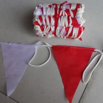 说明:本产品颜色为红、白交替,我们叫红白三角旗。每条足10米。由于使用的尼龙绳比较粗,三角旗布料也比较好,所以可以重复使用。