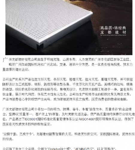 等,并可根据随机设计加工成弧形、梯形、跌级型等造型各异、千变万化的天花产品。我公司先全国招收代理商和订做。广州龙都建材有限公司于2001年11月20日成立,公司位于广州市花都区新华工业区瑞香路26号公司电话:020-36862899欢迎广大客户前来参观与订做