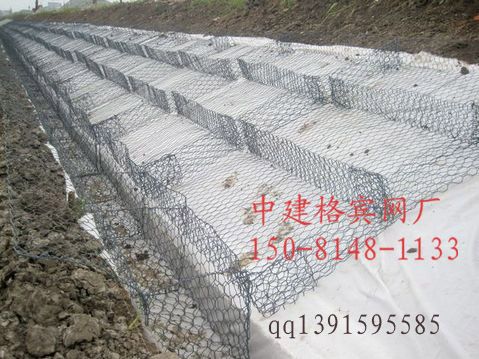 低碳钢丝编织组装而成的网箱,在网箱内放置大小与网孔成比例的毛石,来平铺于河坡或垒砌于河道两边。
