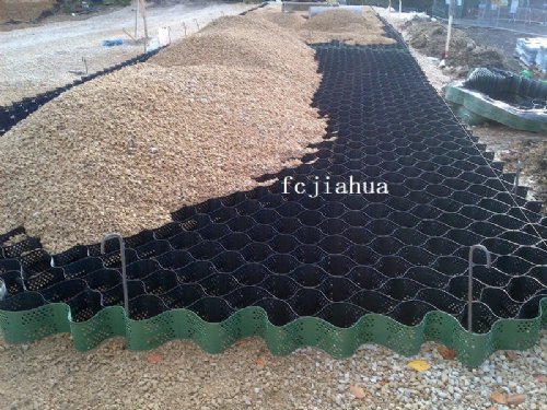 是目前国内外较为流行的一种新型的高强度土工合成材料,是按照GB/T 19274-2003执行标准,将强化的hdpe片材经高强力超声波焊接而形成的一种三维网状格室结构。可伸缩自如,运输可折叠,施工时张拉成网状,展开成蜂窝状的立体网格,填入泥土、碎石、混凝土等松散物料,构成具有强大侧向限制和大刚度的结构体。