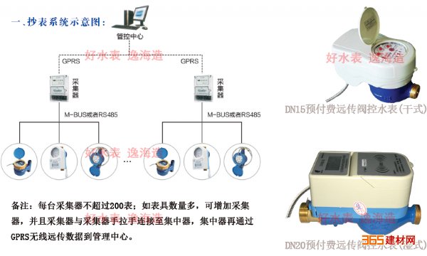 水表的基础上新增加远传数据处理模块(可输出标准RS485或M-BUS信号),数据通过有线连接到数据采集器,采集器再通过无线GPRS方式把水表用水的信息上传到管理中心电脑。其主要特点在于既可以方便管理者收费轻松、用户缴费方便,又可以实时监控每块水表的用水信息和使用情况,是今后水表的发展主要方向。