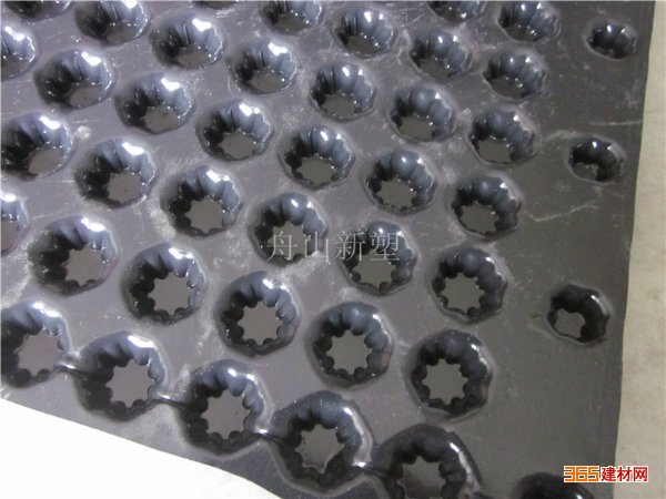 3、抗压强度大,PVC排水板抗压强度大,它的抗压强度是同等厚度PS卷材的1.5倍,hdpe材料的2.5倍。厚度0.7mmPVC材料H20排水板抗压强度在300kpa以上,而同等厚度PS和hdpe材料抗压强度只有150kpa左右。由于其独特的加强筋设计结构一般情况下轿车在上面直行不会压扁任何一个支撑柱。这是其它PS和hdpe材料无法达到的。