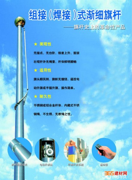 其配件主要有:旗绳,用来升降旗帜。旗冠,就是旗杆*顶部的圆弧形的东西,用来防止雨水流入旗杆内。挂旗杆,将旗帜一段与其相连,固定旗帜之用。