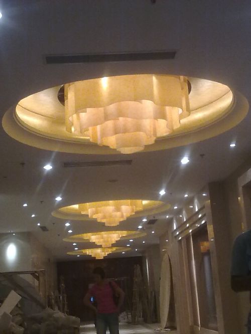 五、 非标灯具:采用西班牙云石、仿云石、玉石、工程树脂琉璃根据设计师,业主深化图纸,完美方案。配合工厂先进的五金工艺制作(铜艺、