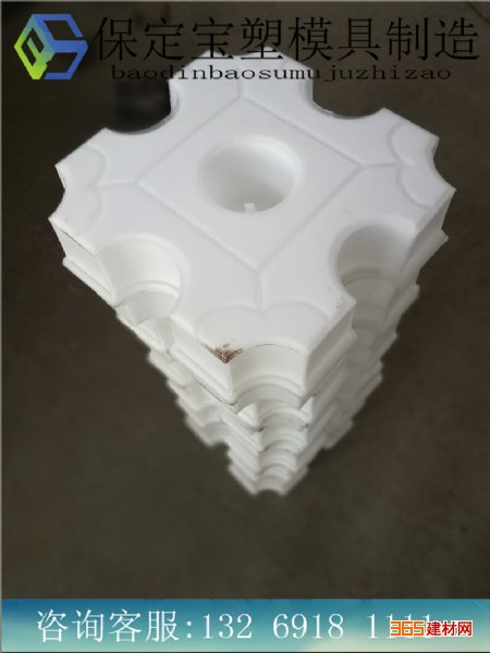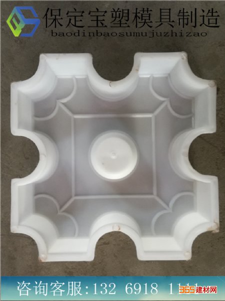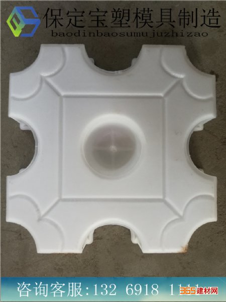草坪植草砖模具四角及四面各有一个半圆形缺口,以便于旁边的草坪砖砖对接时形成一个完整的圆形,而却他本身中间也有一个圆形孔。